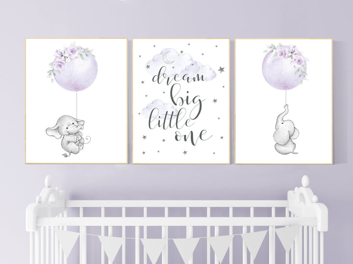 Nursery decor girl purple, elephant nursery, lavender and gray, elephant nursery, lilac nursery, dream big little one, purple nursery