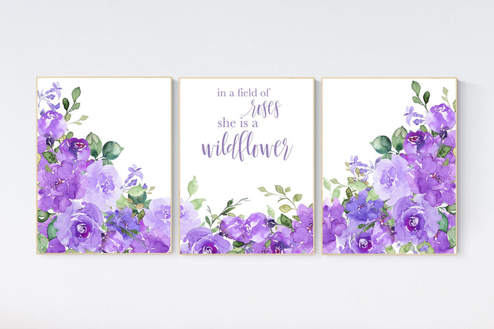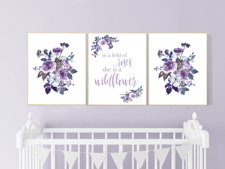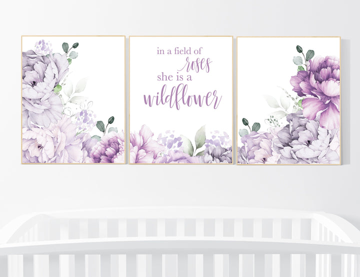 Nursery decor girl purple, floral nursery, flower nursery, purple nursery, lavender, In a field of roses she is a wildflower, floral nursery