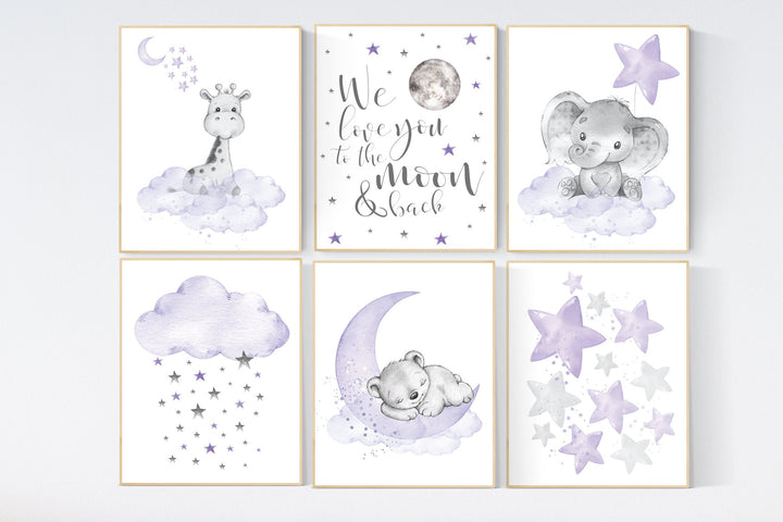Nursery decor girl purple, elephant nursery, lavender and gray, lilac, we love you to the moon and back, moon nursery, girl nursery ideas