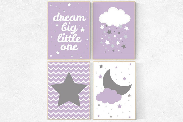 Nursery decor girl purple, moon and stars nursery, cloud and star nursery prints, Lilac nursery, purple nursery, lilac and gray, lavender,
