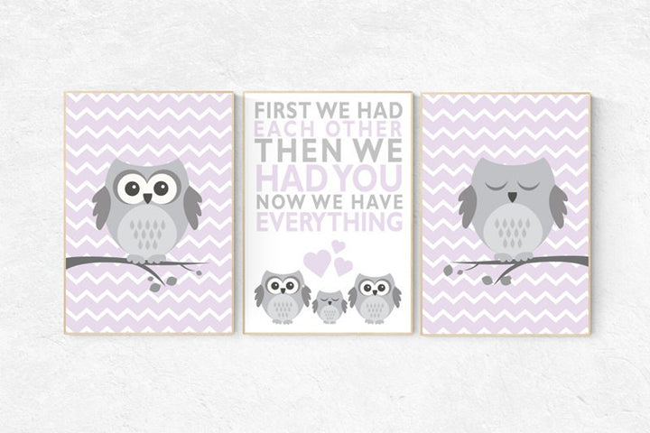 Nursery decor girl purple, Lilac nursery, purple nursery, lilac and gray, First we had each other, owl nursery, lavender, baby room decor
