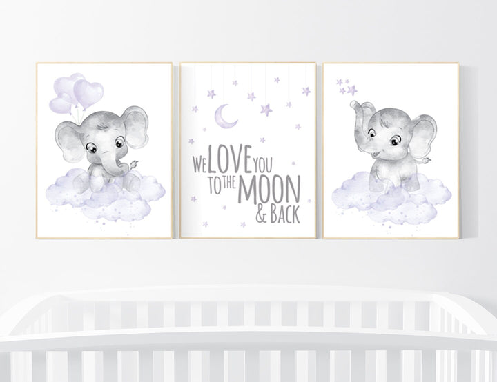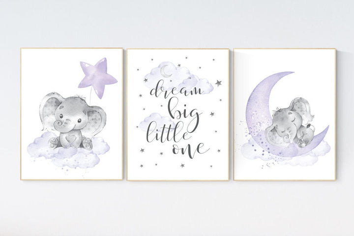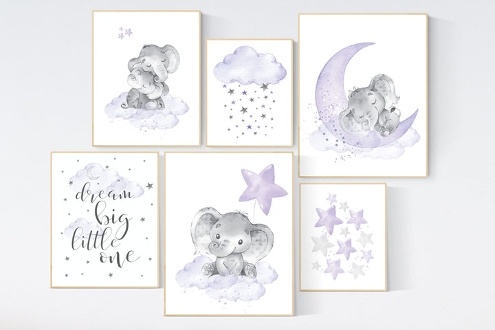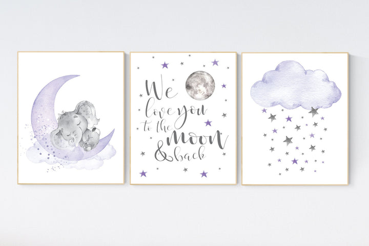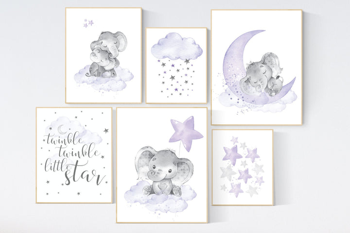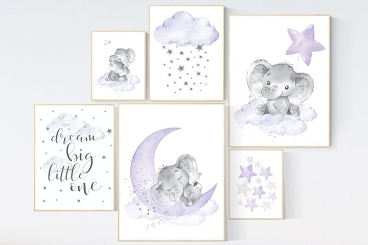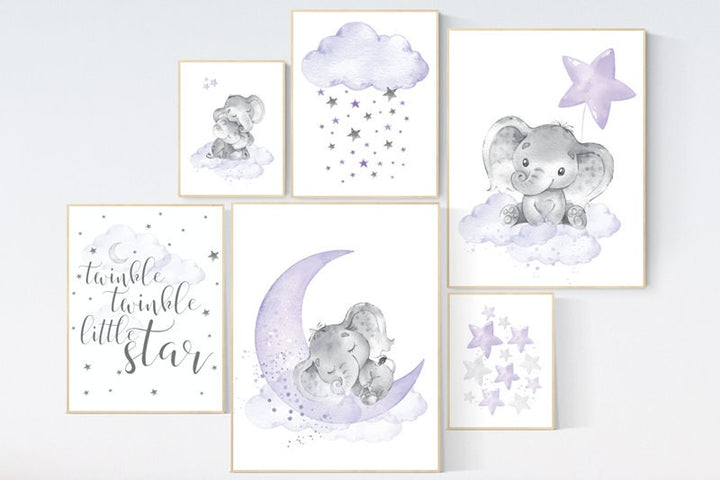 Nursery decor girl purple, nursery decor elephant girl, moon and stars, nursery prints girl, lavender, star nursery, lilac nursery decor,