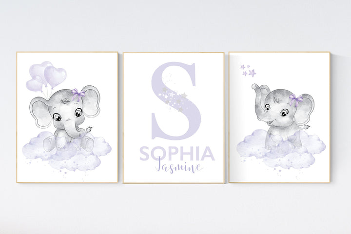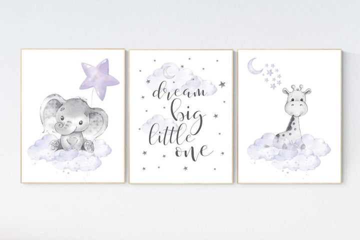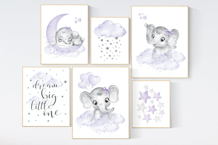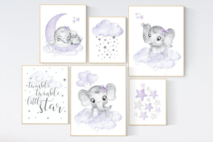 Nursery decor girl purple, lilac nursery decor, nursery decor girl elephant, cloud and stars nursery wall art, nursery prints girl, lavender