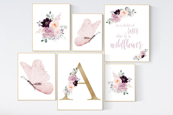 Nursery decor girl purple, mauve, Burgundy, floral nursery, flower nursery, butterfly, in a field of roses she is a wildflower, blush