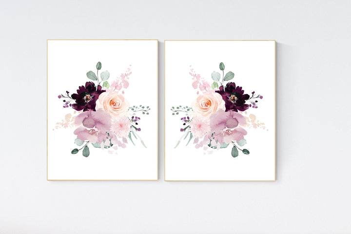 Nursery decor girl purple, mauve, Burgundy, floral nursery, flower nursery, butterfly, girl nursery decor, flower nursery, 2 piece set