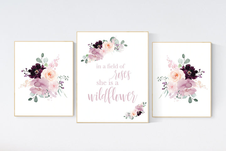 Nursery decor girl purple, mauve, Burgundy, floral nursery, flower nursery, in a field of roses she is a wildflower, blush nursery, monogram