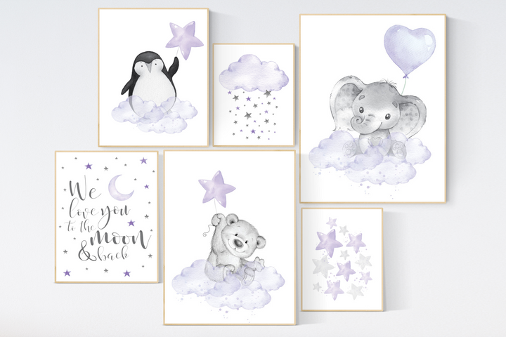 Nursery decor girl purple, nursery decor animals, bear, elephant, penguin, moon and stars, nursery prints girl, lavender, lilac, nursery art