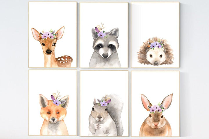 Nursery decor girl woodland, nursery decor girl purple, animal flower crown nursery decor, nursery prints animals, nursery decor girl floral