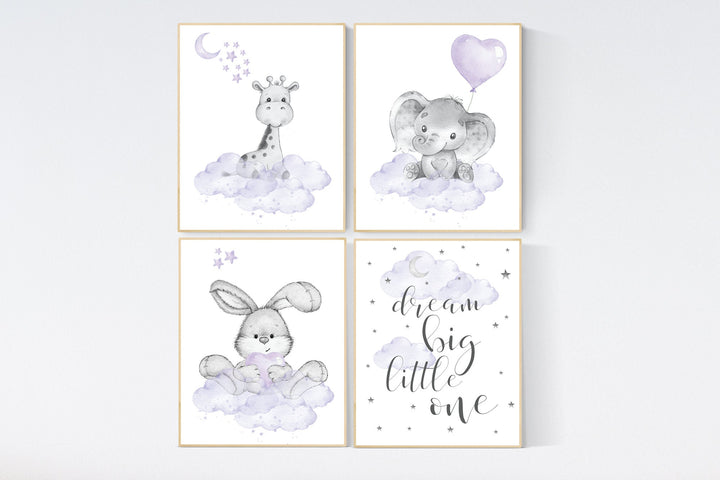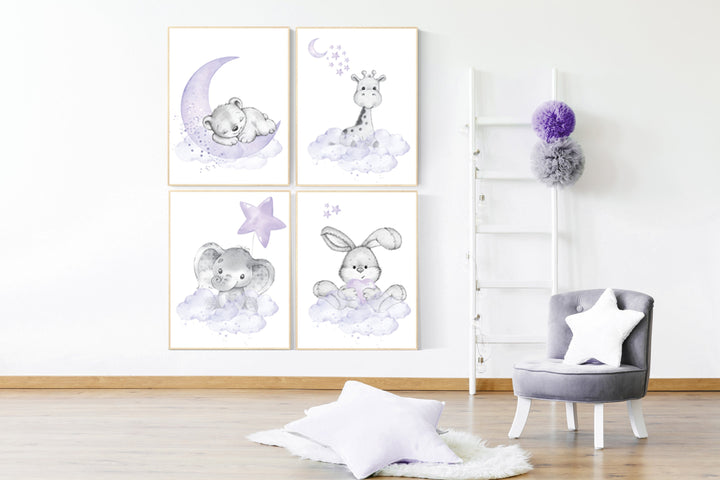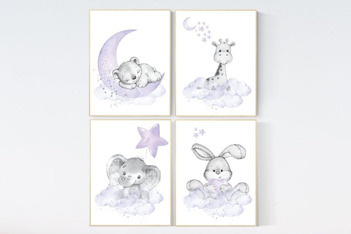 Nursery decor girl woodland, purple nursery, lilac, elephant, bear, giraffe, bunny, animal nursery, lilac nursery, animal nursery prints