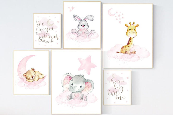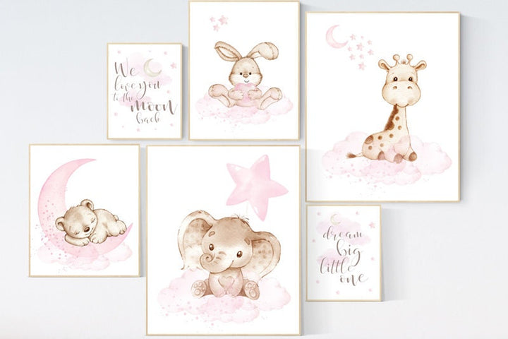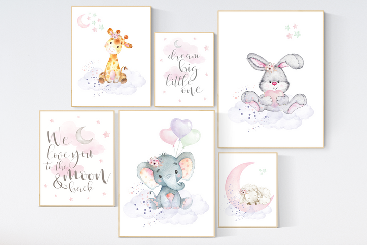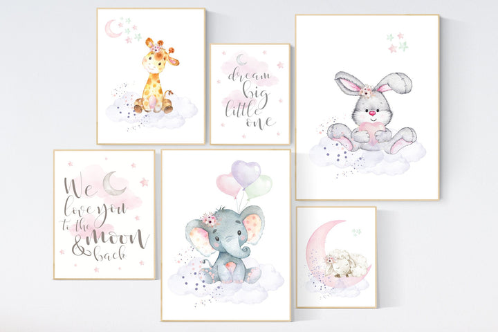 Nursery decor girl, Animal nursery, elephant, bunny, giraffe, sheep, Pink nursery, animal prints