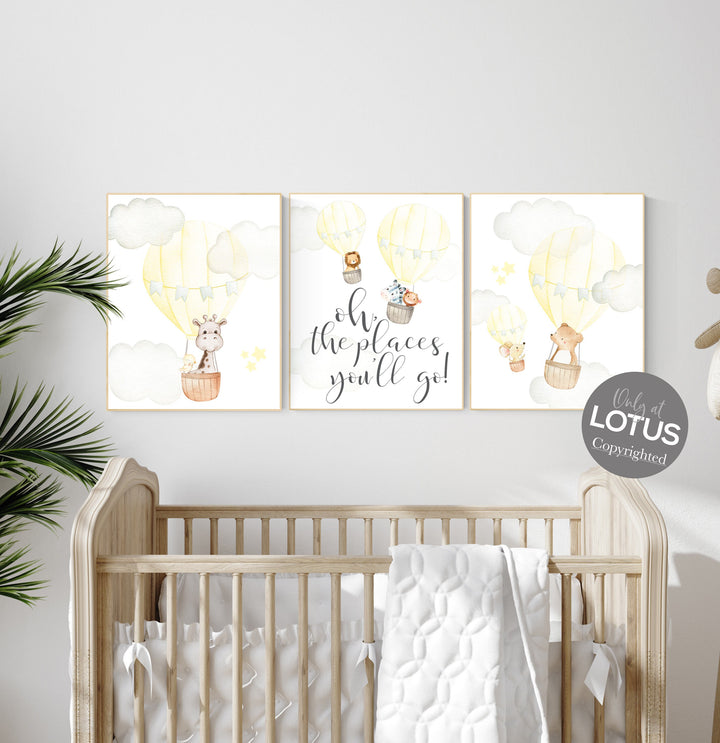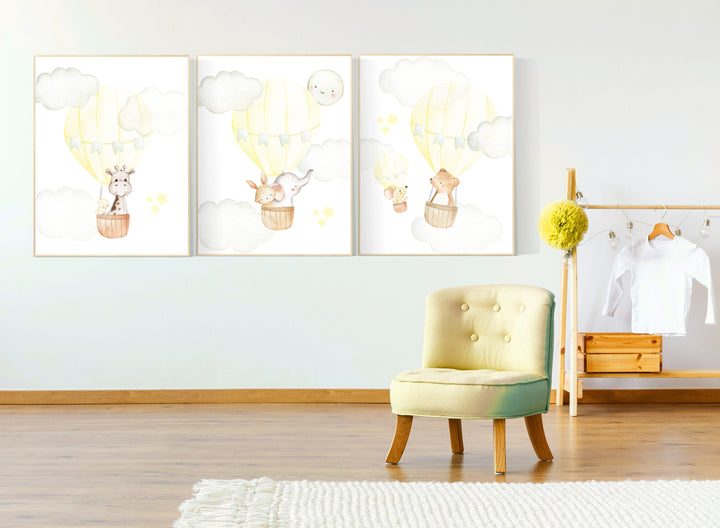 Nursery decor girl yellow, yellow nursery print, nursery wall art animals, hot air balloon nursery art, elephant, giraffe, bear, bunny print