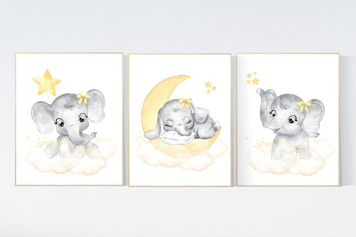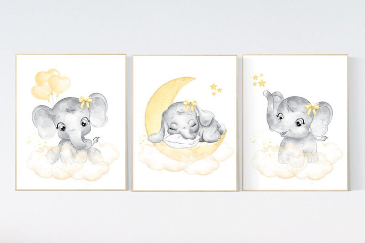 Nursery decor girl yellow, gender neutral, yellow nursery, nursery wall art elephant, moon, stars, yellow and gray nursery art, baby room