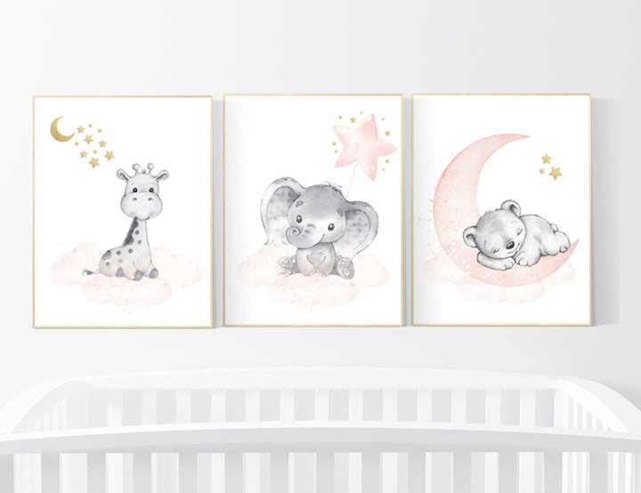 Nursery decor girl woodland, nursery prints set, Nursery decor jungle, nursery prints animal, pink nursery art, elephant giraffe bear bunny