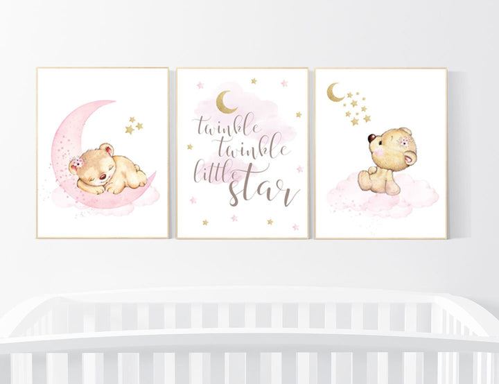 Nursery decor girl, bear nursery decor, twinkle twinkle little star, girl wall art, nursery wall art girl nursery pink gold, nursery art