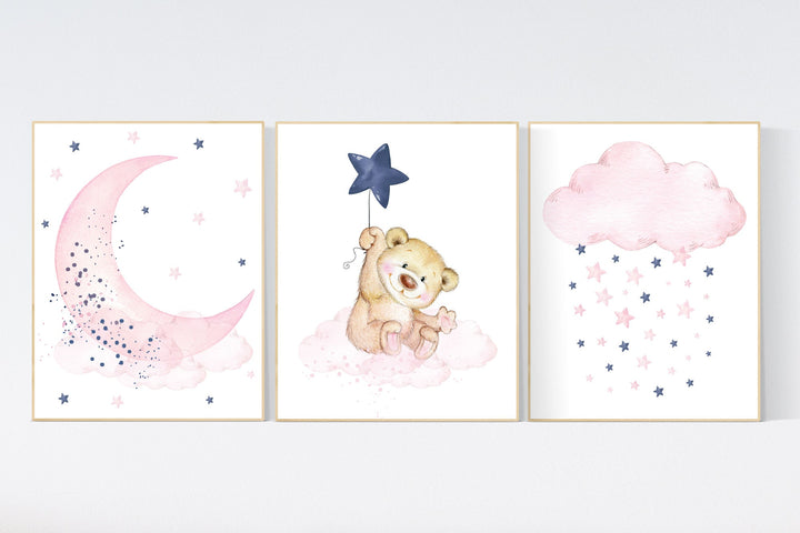 Nursery decor girl, bear nursery, pink and navy, navy pink, stars, moon, cloud, twin nursery, gender neutral, teddy bear, nursery wall decor