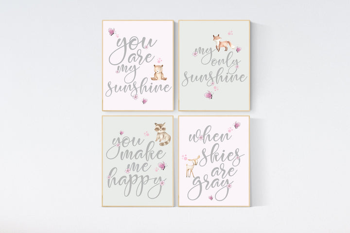 Nursery decor girl you are my sunshine, woodland animals, nursery decor girl pink roses, nursery decor girl floral, flower nursery decor