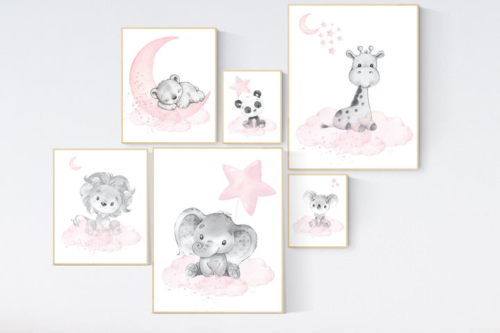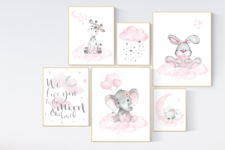 Nursery decor girl, Animal nursery, elephant, bunny, giraffe, sheep, Pink nursery, animal prints, pink and gray, girl nursery decor