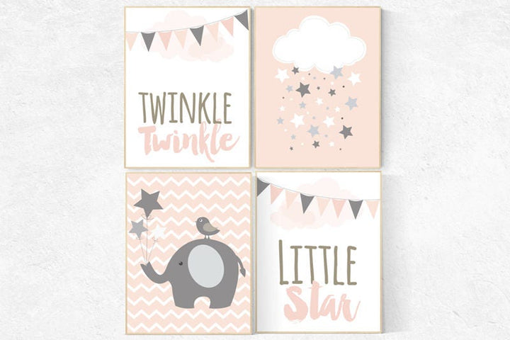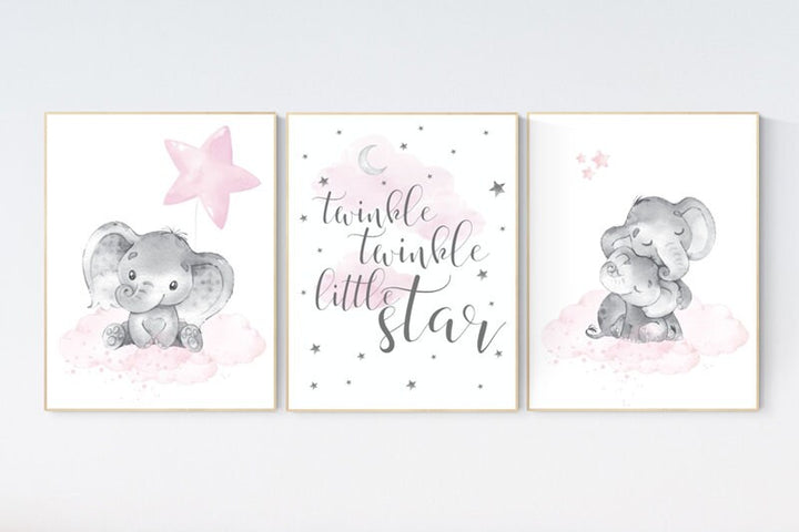 Nursery decor girl, Elephant nursery art, elephant nursery print, twinkle twinkle little star, baby room wall art, girl nursery wall decor
