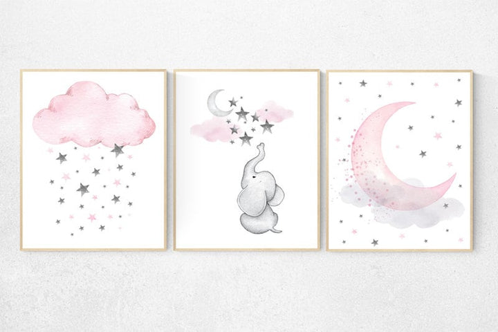 Nursery decor girl, elephant nursery print, pink and gray, nursery decor girl pink, pink and grey, moon and stars, baby girl nursery art
