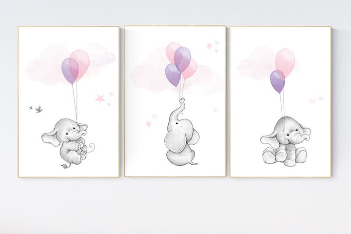 Nursery decor girl, elephant balloon print, pink, purple, elephant wall art, girl nursery wall art, Elephant Nursery Prints, lavender, lilac