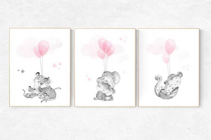 Nursery decor girl, elephant balloon print, elephant artwork, elephant wall art, baby girl nursery wall art, monkey, tiger, baby room decor