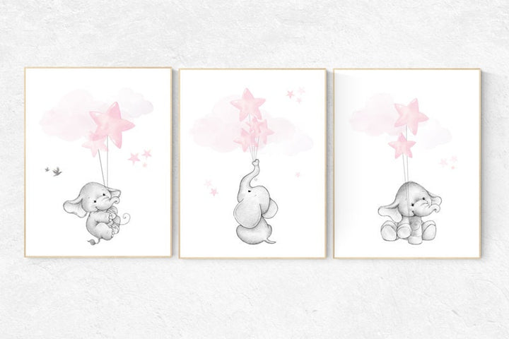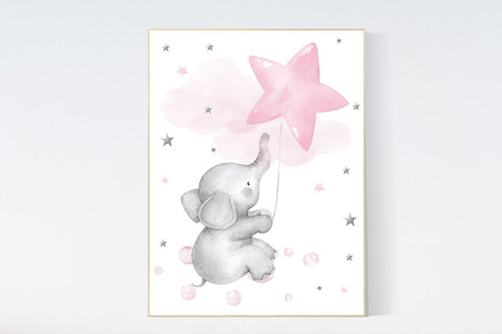 Nursery decor girl, elephant nursery, baby room decor girl pink and grey, girl nursery decor, star balloon, elephant nursery wall art