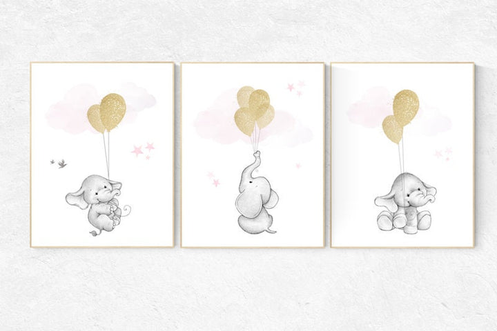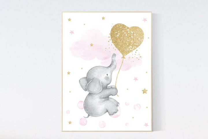 Nursery decor girl, elephant balloon print, nursery wall art girl elephant, gold and pink nursery decor, gold nursery art, nursery prints