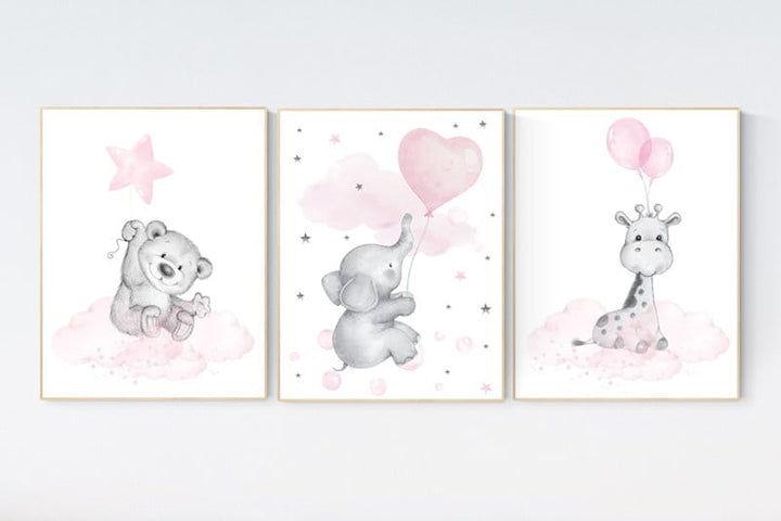 Nursery decor girl, elephant balloon print, giraffe, bear, elephant wall art, baby girl nursery wall art, animal prints, pink and gray