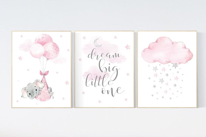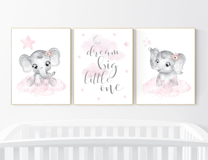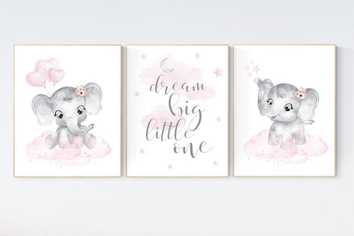 Nursery decor girl, elephant nursery wall art, nursery prints elephant, pink gray, nursery prints elephants, dream big little one