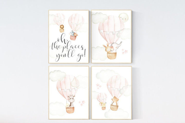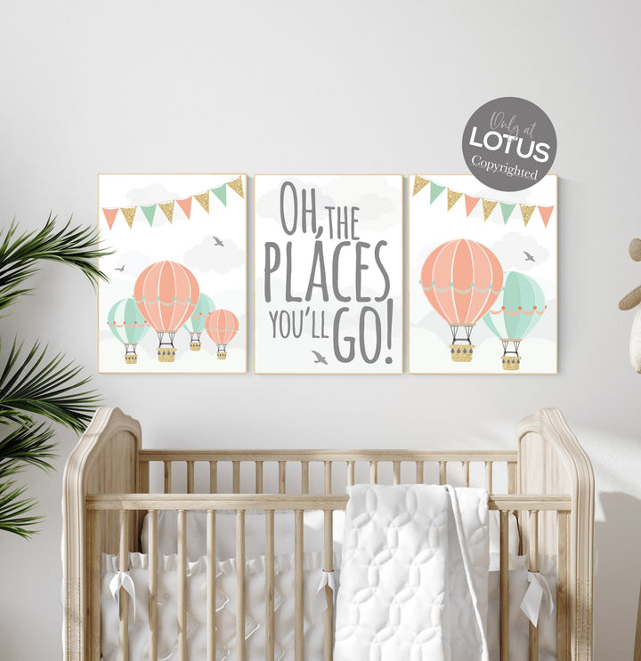 Nursery decor girl, coral mint gold, nursery art girl, hot air balloon nursery, oh the places you'll go, coral and mint, travel theme