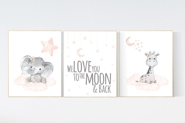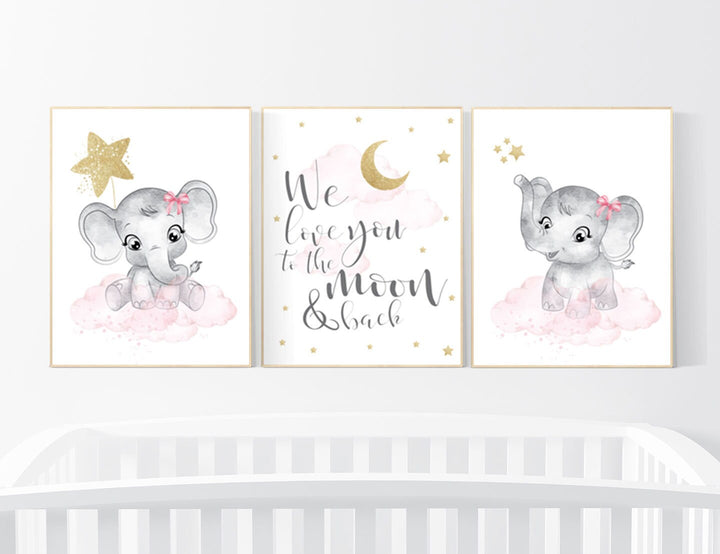 Nursery decor girl, blush gold, moon nursery wall art, elephant wall decor, we love you to the moon and back, blush pink, moon star, cloud