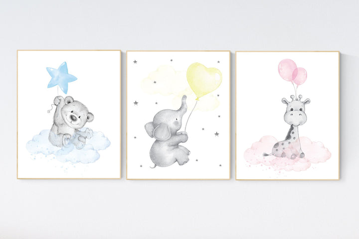 Nursery decor girl, elephant balloon print, giraffe, bear, elephant wall art, baby girl nursery wall art, animal prints, pink, blue, yellow