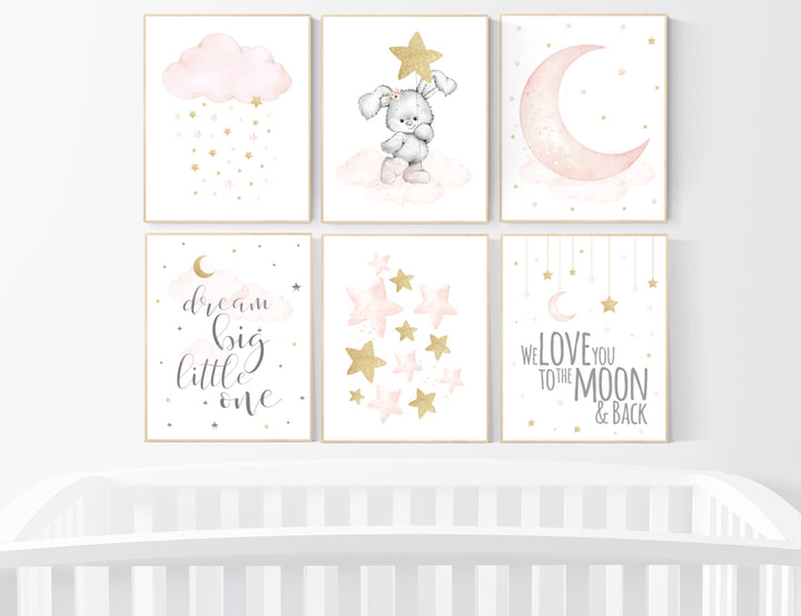 Nursery decor girl, Blush pink and gold, nursery wall art girl, bunny nursery, blush pink gold, girl nursery wall decor, cloud and moon