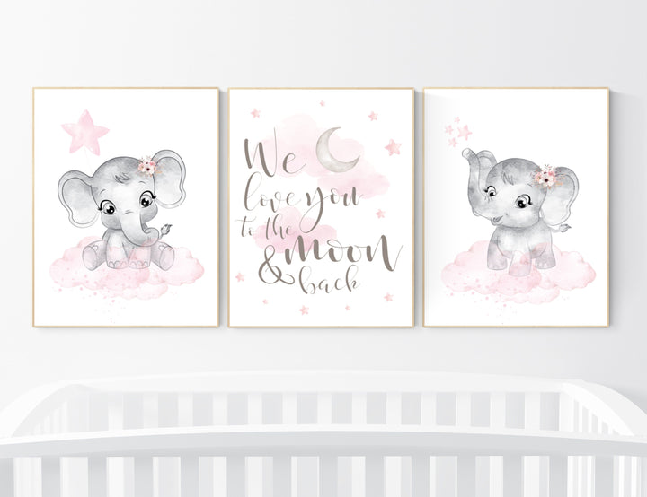 Nursery decor girl, elephant nursery print, pink and gold, Nursery wall art girl, we love you to the moon and back, nursery decor girl