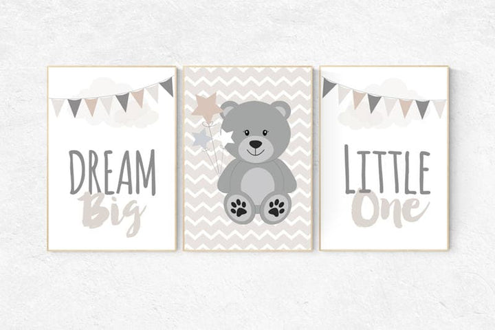 Bear nursery decor, gender neutral nursery, dream big little one, neutral nursery, nursery wall art bear, bear nursery print, gray nursery