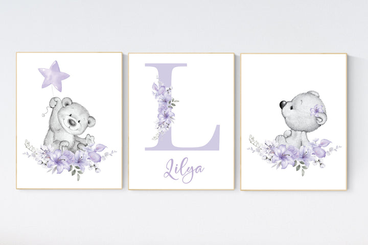 Bear nursery, lilac nursery, nursery decor girl flowers, purple nursery, nursery decor girl boho, floral nursery prints, lilac print