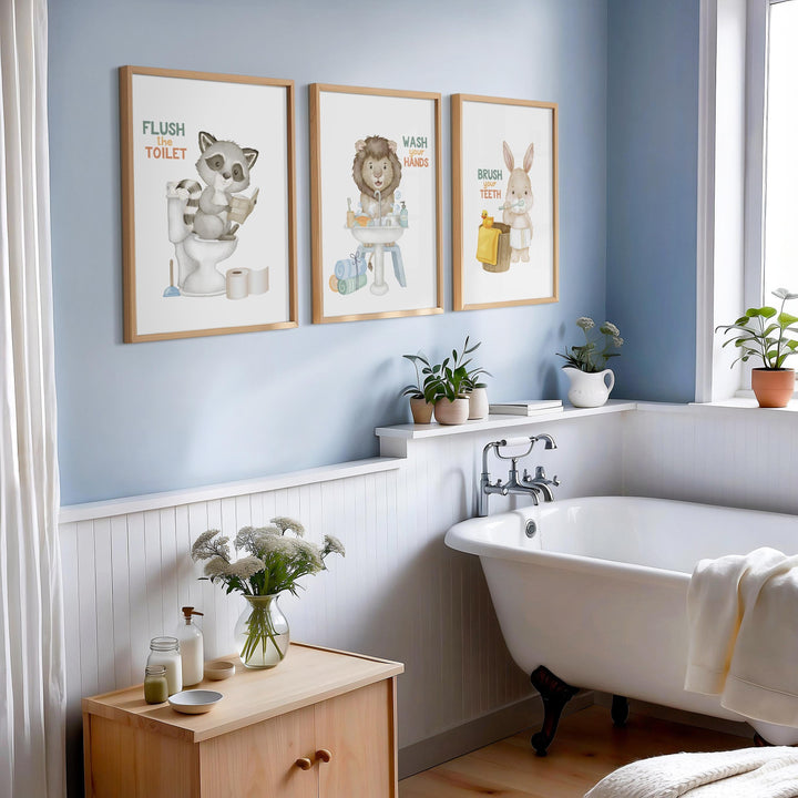 Bathroom prints for kids, bathroom art, Bathroom wall art, kids Bathroom decor, Wash Your Hands, flush the toilet, brush your teeth