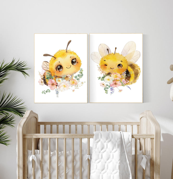 Bee print, bee nursery, flower nursery, yellow nursery, gender neutral, nursery wall art prints, baby room wall art, girl nursery