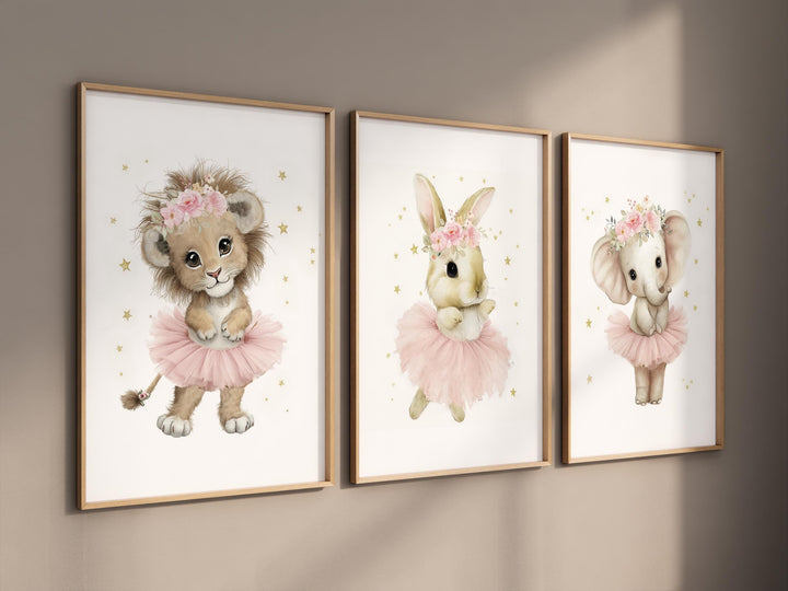 Ballerina Nursery Wall Art Set – Lion, Bunny & Elephant Ballet Prints, Pink Tutu Animal Room Decor, Girls Room Sweet Ballet Animal Art