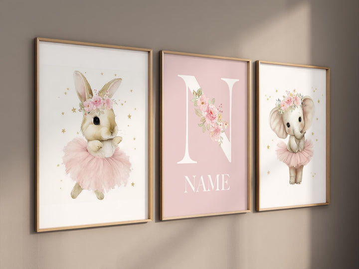 Ballerina Nursery Wall Art Set – Personalized Pink Elephant Bunny Prints, Girl Bedroom Decor, Custom Name Art, Baby Girl Room Wall Decor