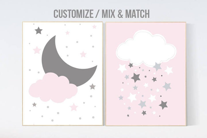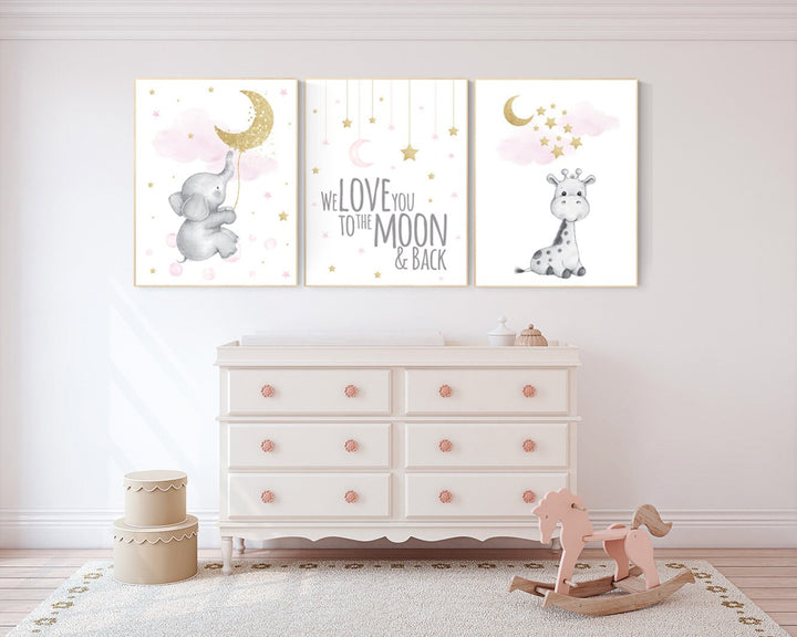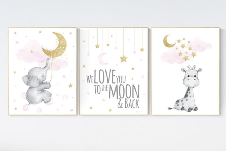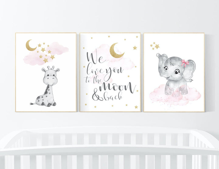 Nursery decor girl, giraffe nursery, baby room decor girl gold and pink, girl nursery decor, cloud and stars, elephant nursery wall art