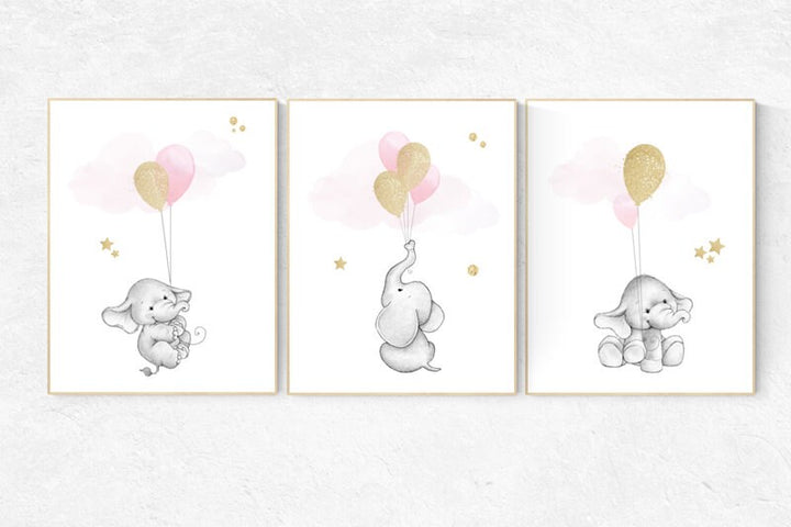 Nursery decor girl, gold and pink nursery decor, elephant balloon print, nursery wall art girl elephant, , gold nursery art, nursery prints