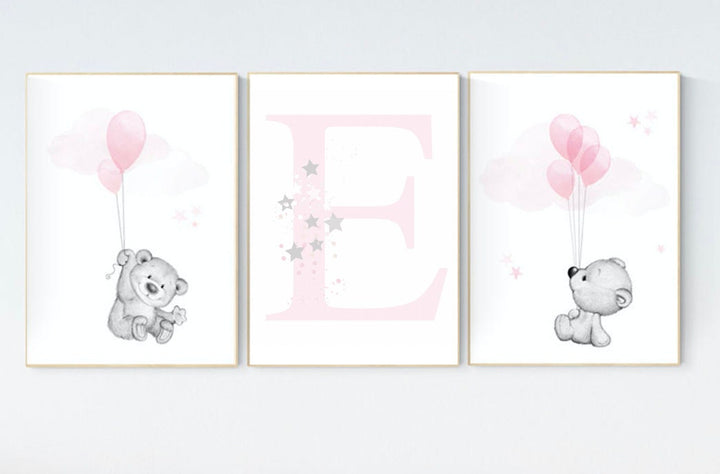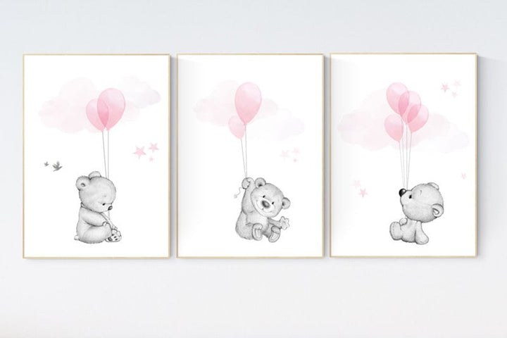 Nursery decor girl, nursery decor bear, bear nursery print, teddy bear, pink grey nursery, nursery wall art animals, girl room decor