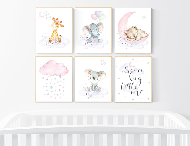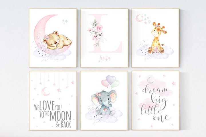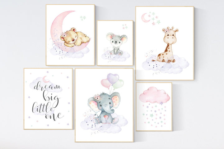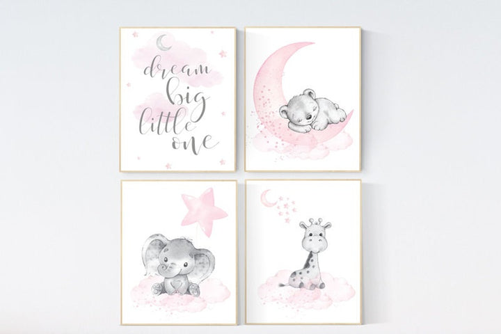 Nursery decor girl, elephant, bear, giraffe, animal nursery, moon, star, bear nursery, pink gray, woodland animals, dream big little one