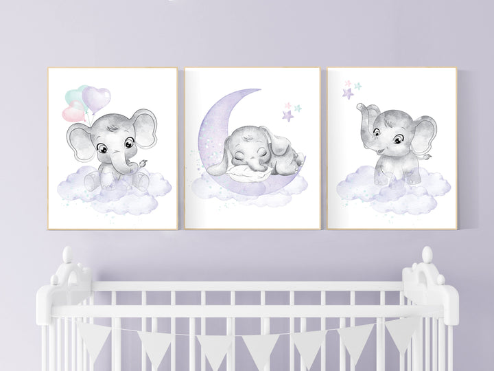 Nursery decor girl, mint, lilac, pink, Nursery wall art girl elephant, nursery decor girl purple, nursery wall art stars, nursery prints
