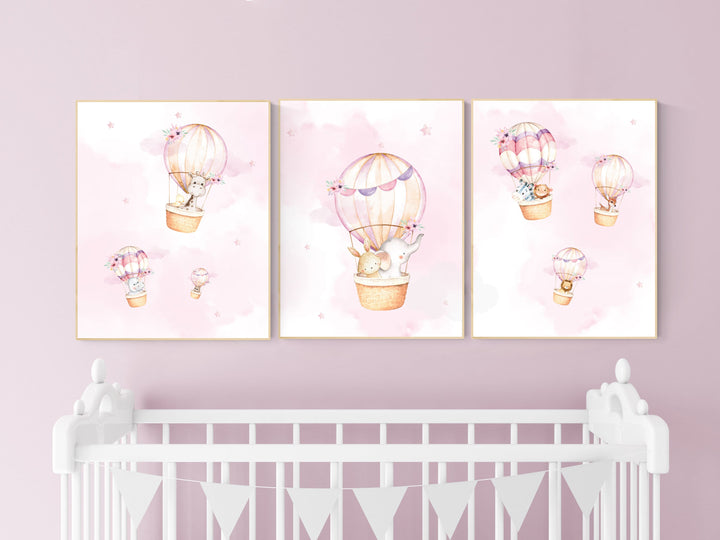 Nursery decor girl, hot air balloon nursery girls, animal nursery, hot air balloon art for nursery, pink nursery prints, girls room wall art