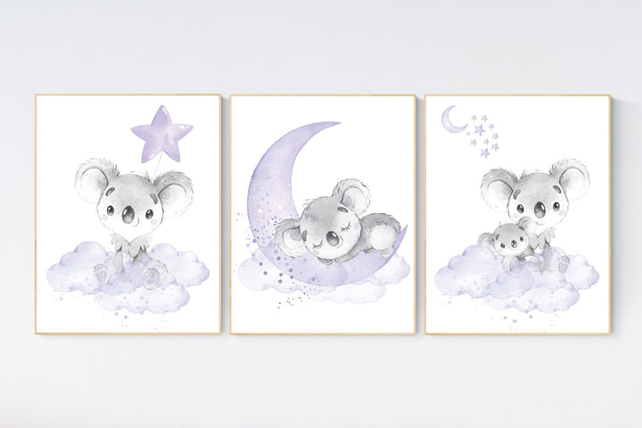 Nursery decor girl, koala nursery, moon and stars, purple nursery art, nursery prints animals, lilac nursery decor, koala mother and baby
