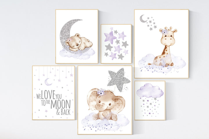 Nursery decor girl, lilac and silver nursery, animal nursery, we love you to the moon and back, purple silver, lavender nursery, animals