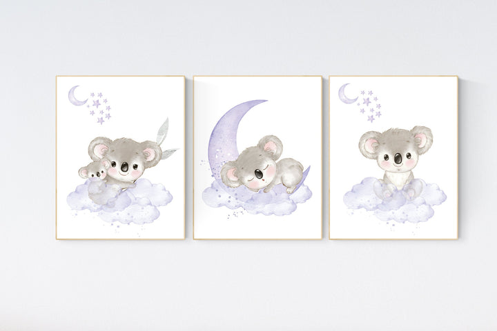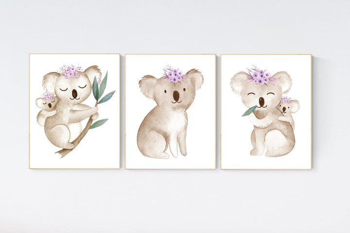Nursery decor girl, koala nursery, nursery prints animals, lilac nursery decor, koala bear nursery, gender neutral nursery