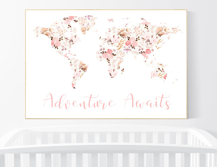 Nursery decor girl, Floral World Map, Girl Nursery Decor, Travel Nursery Art, blush nursery, Nursery baby girl room, she's going places
